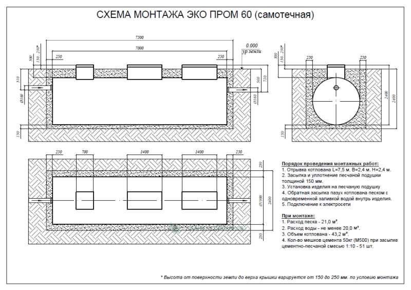Стандартный монтаж- Копка котлована с подготовкой для УОСВ, его установкой и обратной засыпкой- Песчаная подушка- Копка траншеи для прокладки труб с обратной засыпкой, с материалом – 4 м до станции, 4 м после станции (в любой пропорции)- Врезка труб в станцию, с их пайкой (если нет с завода) – 2 шт,- Прокладка электрического кабеля в пнд трубе – 10 м- Пуско – наладочные работы, тестирование станции- Подключение электрооборудования (компрессоров, насосов)- Консультация по пользованию ЛОС | от 20 000 ₽ |
