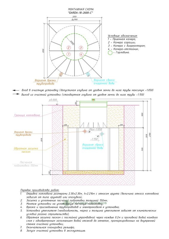 Стандартный монтаж- Копка котлована с подготовкой для УОСВ, его установкой и обратной засыпкой- Песчаная подушка- Копка траншеи для прокладки труб с обратной засыпкой, с материалом – 4 м до станции, 4 м после станции (в любой пропорции)- Врезка труб в станцию, с их пайкой (если нет с завода) – 2 шт,- Прокладка электрического кабеля в пнд трубе – 10 м- Пуско – наладочные работы, тестирование станции- Подключение электрооборудования (компрессоров, насосов)- Консультация по пользованию ЛОС | от 20 000 ₽ |