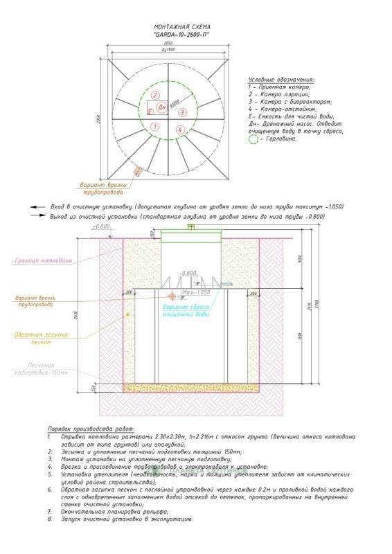 Стандартный монтаж- Копка котлована с подготовкой для УОСВ, его установкой и обратной засыпкой- Песчаная подушка- Копка траншеи для прокладки труб с обратной засыпкой, с материалом – 4 м до станции, 4 м после станции (в любой пропорции)- Врезка труб в станцию, с их пайкой (если нет с завода) – 2 шт,- Прокладка электрического кабеля в пнд трубе – 10 м- Пуско – наладочные работы, тестирование станции- Подключение электрооборудования (компрессоров, насосов)- Консультация по пользованию ЛОС | от 20 000 ₽ |