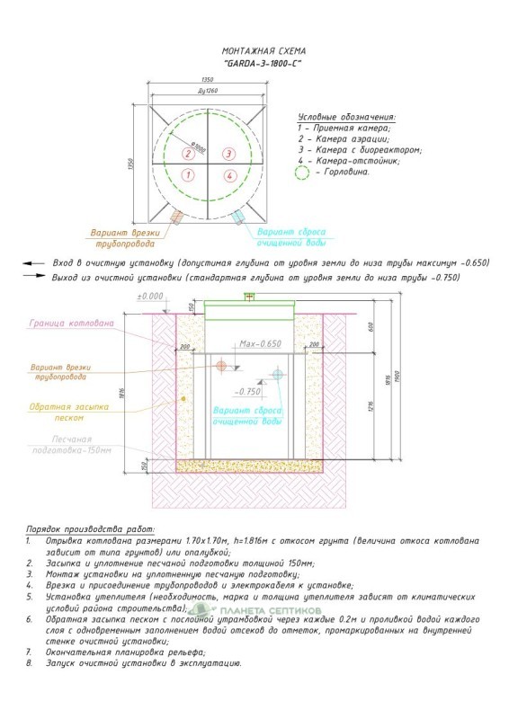 Стандартный монтаж- Копка котлована с подготовкой для УОСВ, его установкой и обратной засыпкой- Песчаная подушка- Копка траншеи для прокладки труб с обратной засыпкой, с материалом – 4 м до станции, 4 м после станции (в любой пропорции)- Врезка труб в станцию, с их пайкой (если нет с завода) – 2 шт,- Прокладка электрического кабеля в пнд трубе – 10 м- Пуско – наладочные работы, тестирование станции- Подключение электрооборудования (компрессоров, насосов)- Консультация по пользованию ЛОС | от 20 000 ₽ |