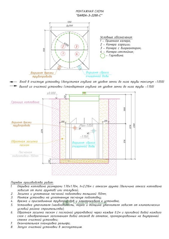 Стандартный монтаж- Копка котлована с подготовкой для УОСВ, его установкой и обратной засыпкой- Песчаная подушка- Копка траншеи для прокладки труб с обратной засыпкой, с материалом – 4 м до станции, 4 м после станции (в любой пропорции)- Врезка труб в станцию, с их пайкой (если нет с завода) – 2 шт,- Прокладка электрического кабеля в пнд трубе – 10 м- Пуско – наладочные работы, тестирование станции- Подключение электрооборудования (компрессоров, насосов)- Консультация по пользованию ЛОС | от 20 000 ₽ |