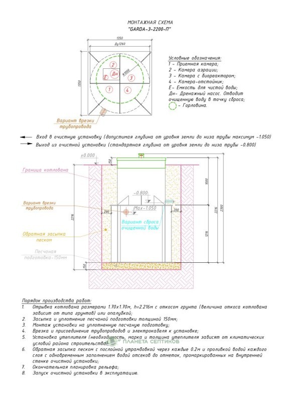 Стандартный монтаж- Копка котлована с подготовкой для УОСВ, его установкой и обратной засыпкой- Песчаная подушка- Копка траншеи для прокладки труб с обратной засыпкой, с материалом – 4 м до станции, 4 м после станции (в любой пропорции)- Врезка труб в станцию, с их пайкой (если нет с завода) – 2 шт,- Прокладка электрического кабеля в пнд трубе – 10 м- Пуско – наладочные работы, тестирование станции- Подключение электрооборудования (компрессоров, насосов)- Консультация по пользованию ЛОС | от 20 000 ₽ |