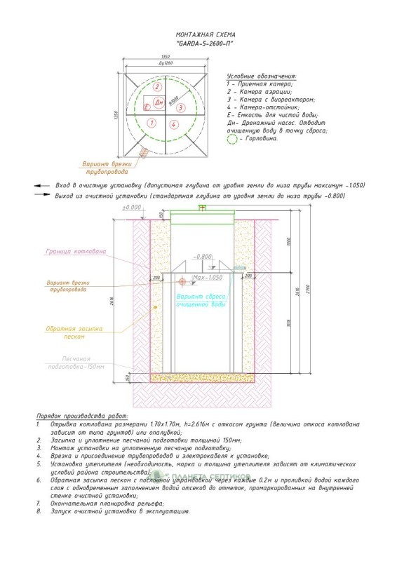 Стандартный монтаж- Копка котлована с подготовкой для УОСВ, его установкой и обратной засыпкой- Песчаная подушка- Копка траншеи для прокладки труб с обратной засыпкой, с материалом – 4 м до станции, 4 м после станции (в любой пропорции)- Врезка труб в станцию, с их пайкой (если нет с завода) – 2 шт,- Прокладка электрического кабеля в пнд трубе – 10 м- Пуско – наладочные работы, тестирование станции- Подключение электрооборудования (компрессоров, насосов)- Консультация по пользованию ЛОС | от 20 000 ₽ |