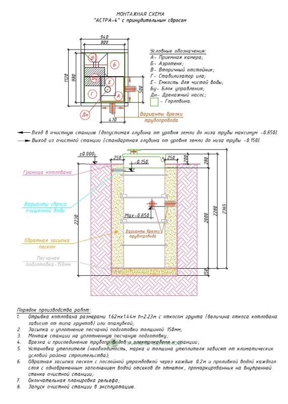 Стандартный монтаж- Копка котлована с подготовкой для УОСВ, его установкой и обратной засыпкой- Песчаная подушка- Копка траншеи для прокладки труб с обратной засыпкой, с материалом – 4 м до станции, 4 м после станции (в любой пропорции)- Врезка труб в станцию, с их пайкой (если нет с завода) – 2 шт,- Прокладка электрического кабеля в пнд трубе – 10 м- Пуско – наладочные работы, тестирование станции- Подключение электрооборудования (компрессоров, насосов)- Консультация по пользованию ЛОС | от 20 000 ₽ |