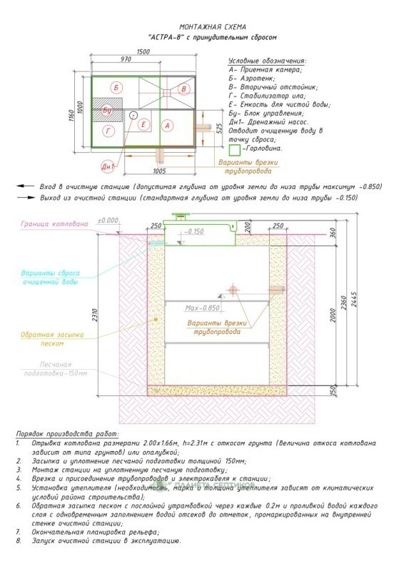 Стандартный монтаж- Копка котлована с подготовкой для УОСВ, его установкой и обратной засыпкой- Песчаная подушка- Копка траншеи для прокладки труб с обратной засыпкой, с материалом – 4 м до станции, 4 м после станции (в любой пропорции)- Врезка труб в станцию, с их пайкой (если нет с завода) – 2 шт,- Прокладка электрического кабеля в пнд трубе – 10 м- Пуско – наладочные работы, тестирование станции- Подключение электрооборудования (компрессоров, насосов)- Консультация по пользованию ЛОС | от 20 000 ₽ |